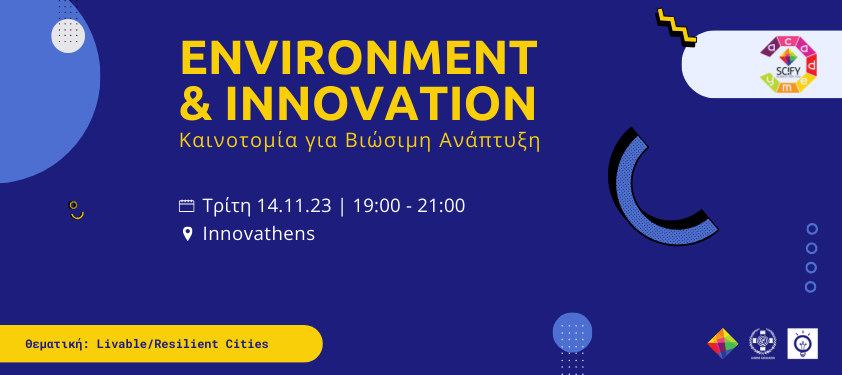 SciFY invites you to the first event of the“Environment & Innovation” series on “Livable & Resilient Cities”, on Tuesday 14 November 2023, at 19:00, which will take place at Innovathens(100 Piraeus 100 Gazi, 11854 Athens). The event is mainly aimed at professionals, researchers, and students from the fields of environment, technology, and finance.